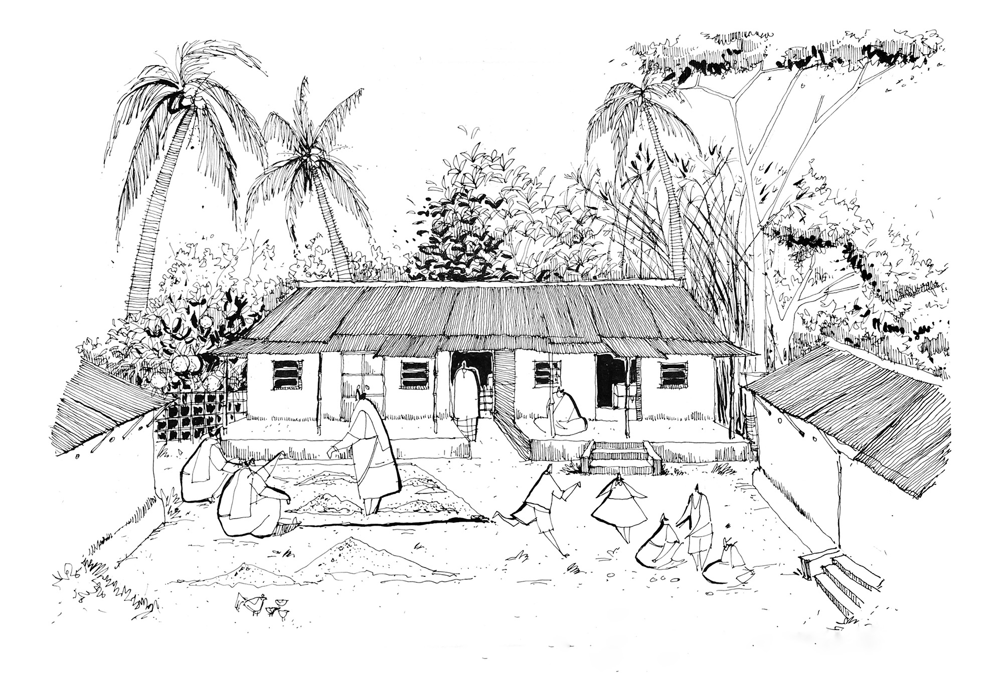 The kitchen was towards the north. This large room had three stoves. In winter, we would sit beside it on woven mats, eating smoky hot pithas and steaming heavenly curries made of cauliflower, beans, and coriander. Ah, if only I could share that taste with you!