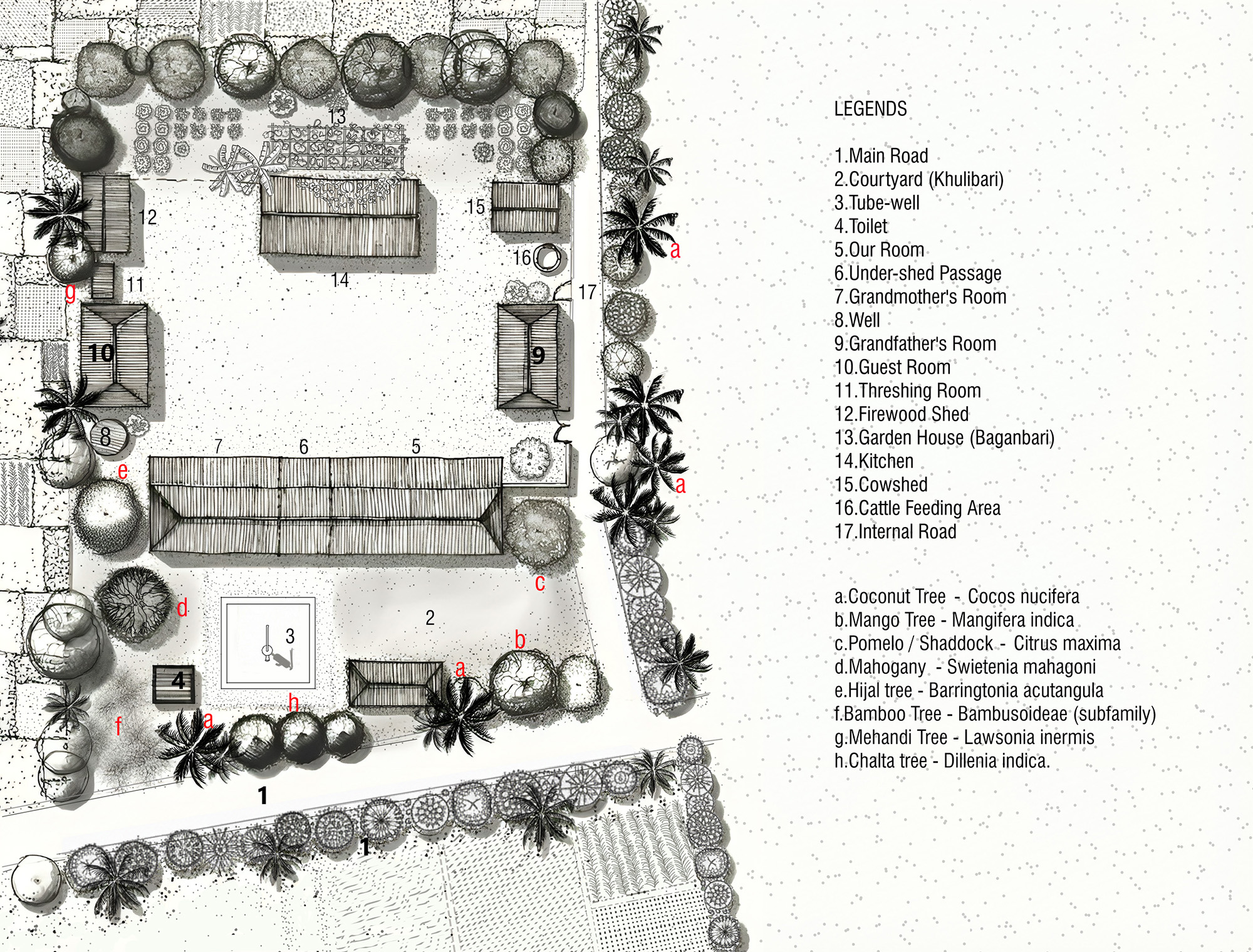 ফল-ফলাদির নানা গাছ লাগানোর প্রচলন ছিলো বাড়িতে। দাদীর কল্যাণেই বাড়ির চারপাশ ছিল এত সবুজে ঘেরা। বাড়ির প্রধান প্রবেশের পথ দিয়ে ঢুকতেই জাম্বুরা ও আম গাছের অবস্থান দেখতে পাবে। খুলিবাড়ির সাথে লাগোয়া রাস্তার সারি ধরে নারিকেল গাছ। খুলিবাড়ির পাশে গোসলখানার পিছনে দক্ষিণ-পশ্চিম কোণে রয়েছে বাশঁঝাড়। পশ্চিমে কাঁঠাল গাছ ও সুপারি গাছের সারি একের পর অন্যটা। এদিকে আরও আছে জিওল ও মেহগনি গাছ। তবে ছোট বেলায় আমার চোখে সবচেয়ে সুন্দর গাছ ছিল মেহেদী গাছ! বাসার সবাই যে মেহেদী পাতা বেটে লাগাবার সময় আমার হাতেও একটু লাগিয়ে দিত। ছোট্ট বয়সে ওই হাতে টুকটুকে করার ওপর ছিল বড্ড শখ। রান্না ঘরের পিছনে সবজির বাগানের পরই আম গাছ এবং সুপারি গাছের সারি। পূর্ব দিকে বেশ কয়েকটা নারিকেল গাছ এবং পেয়ারা গাছ। সবচেয়ে মজার ঘটনা হচ্ছে গাছ থেকে ফল পাড়তে যেয়ে পরে যাওয়া। কোমড়ে বড্ড লেগেছিলো সেবার।