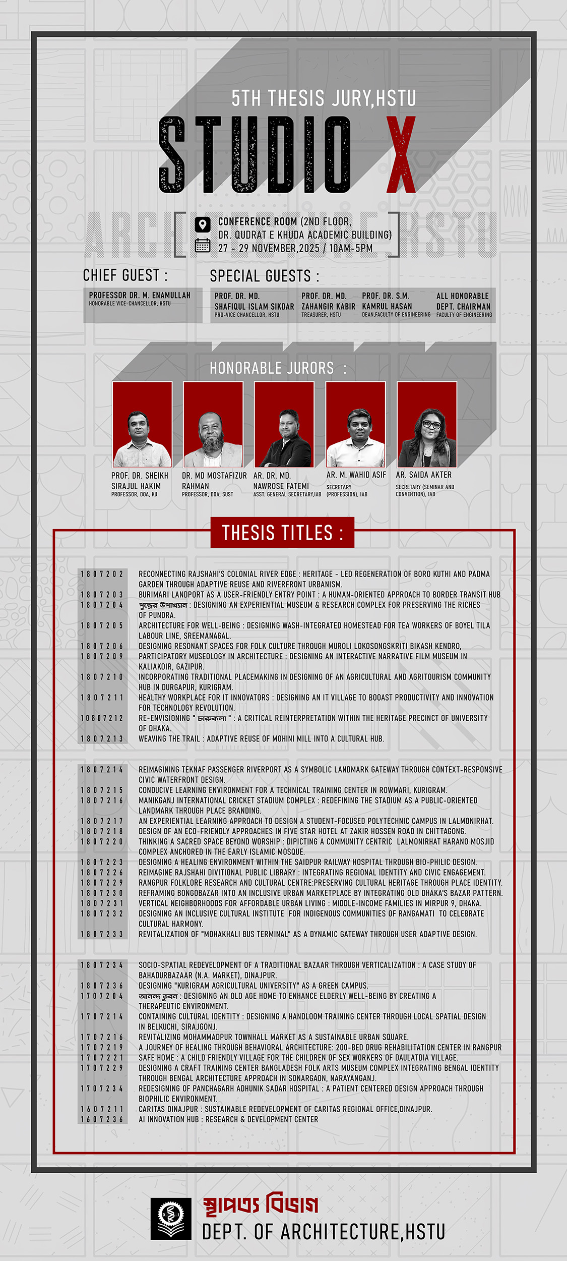 26 November, 2025The Department of Architecture at Hajee Mohammad Danesh Science and Technology University (HSTU) is pleased to announce its 5th Thesis Jury, “STUDIO X.” This pivotal three-day event, from November 27-29, 2025, will showcase the final thesis projects of our graduating students before a distinguished panel of academic and professional jurors.