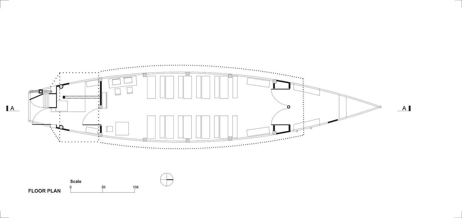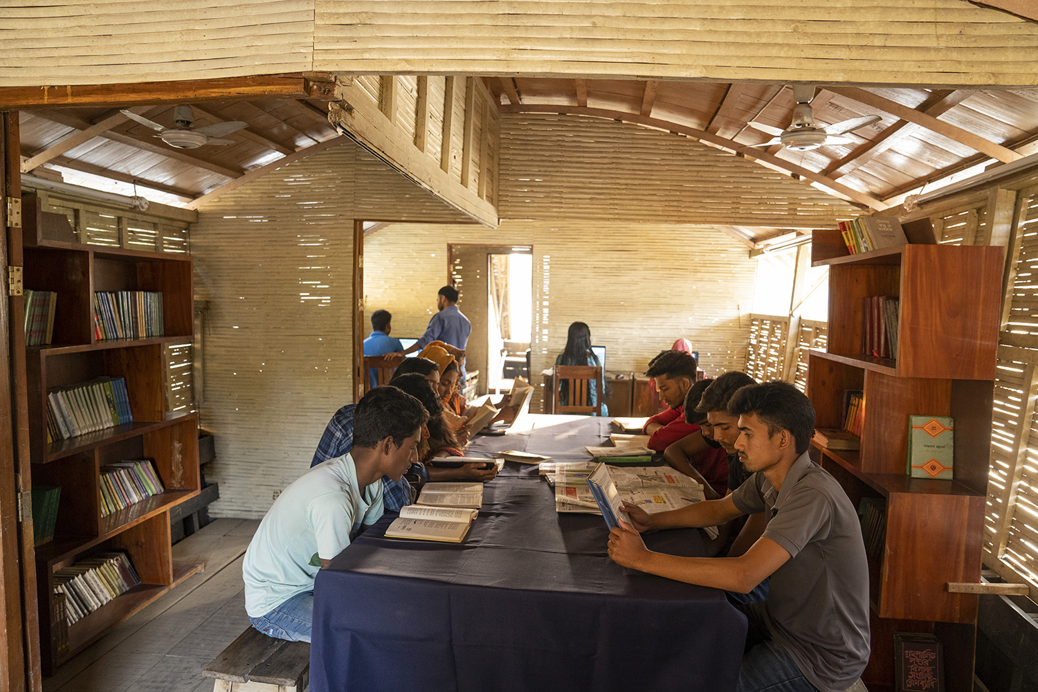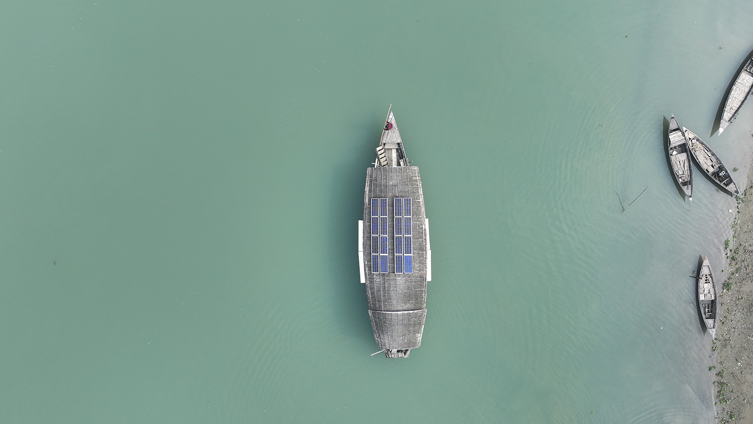 Each boat is carefully designed to respond to both environmental conditions and community needs. The fleet includes classroom boats for children, libraries with open shelving, training boats for sustainable farming and sewing, and mobile clinics providing primary healthcare. Every vessel is built in riverside yards using locally available, low-impact materials such as sal wood, bamboo and recycled tin sheets. Iron beams support column-free interiors, while curved, layered roofs are shaped to deflect monsoon rains and maintain balance. Flat-bottomed hulls allow the boats to navigate shallow waters during the monsoon season. Solar panels provide energy for lighting, learning equipment and medical tools, while old kerosene lanterns have been repurposed as solar light casings – combining cultural familiarity with renewable energy innovation.