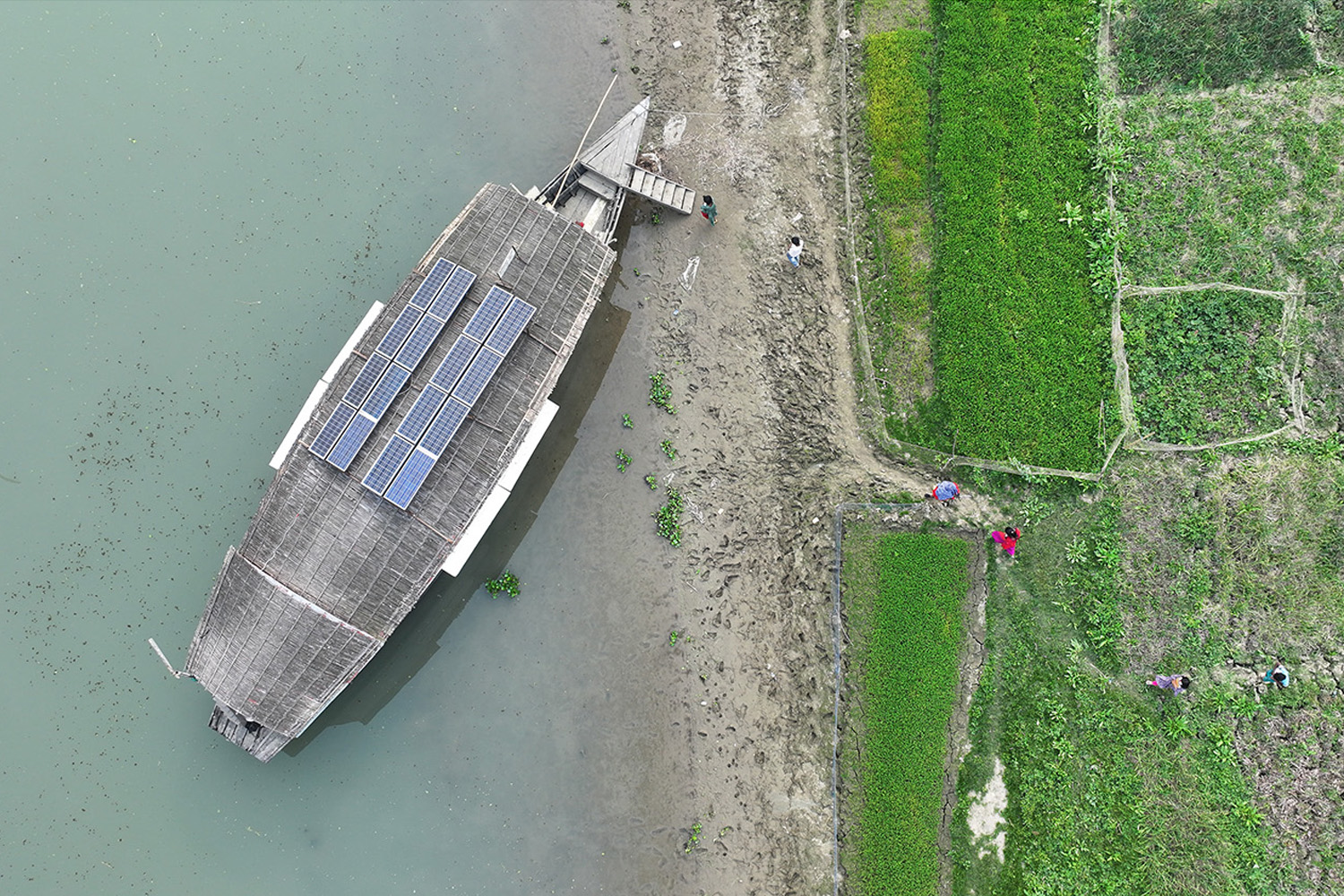 Each boat is carefully designed to respond to both environmental conditions and community needs. The fleet includes classroom boats for children, libraries with open shelving, training boats for sustainable farming and sewing, and mobile clinics providing primary healthcare. Every vessel is built in riverside yards using locally available, low-impact materials such as sal wood, bamboo and recycled tin sheets. Iron beams support column-free interiors, while curved, layered roofs are shaped to deflect monsoon rains and maintain balance. Flat-bottomed hulls allow the boats to navigate shallow waters during the monsoon season. Solar panels provide energy for lighting, learning equipment and medical tools, while old kerosene lanterns have been repurposed as solar light casings – combining cultural familiarity with renewable energy innovation.