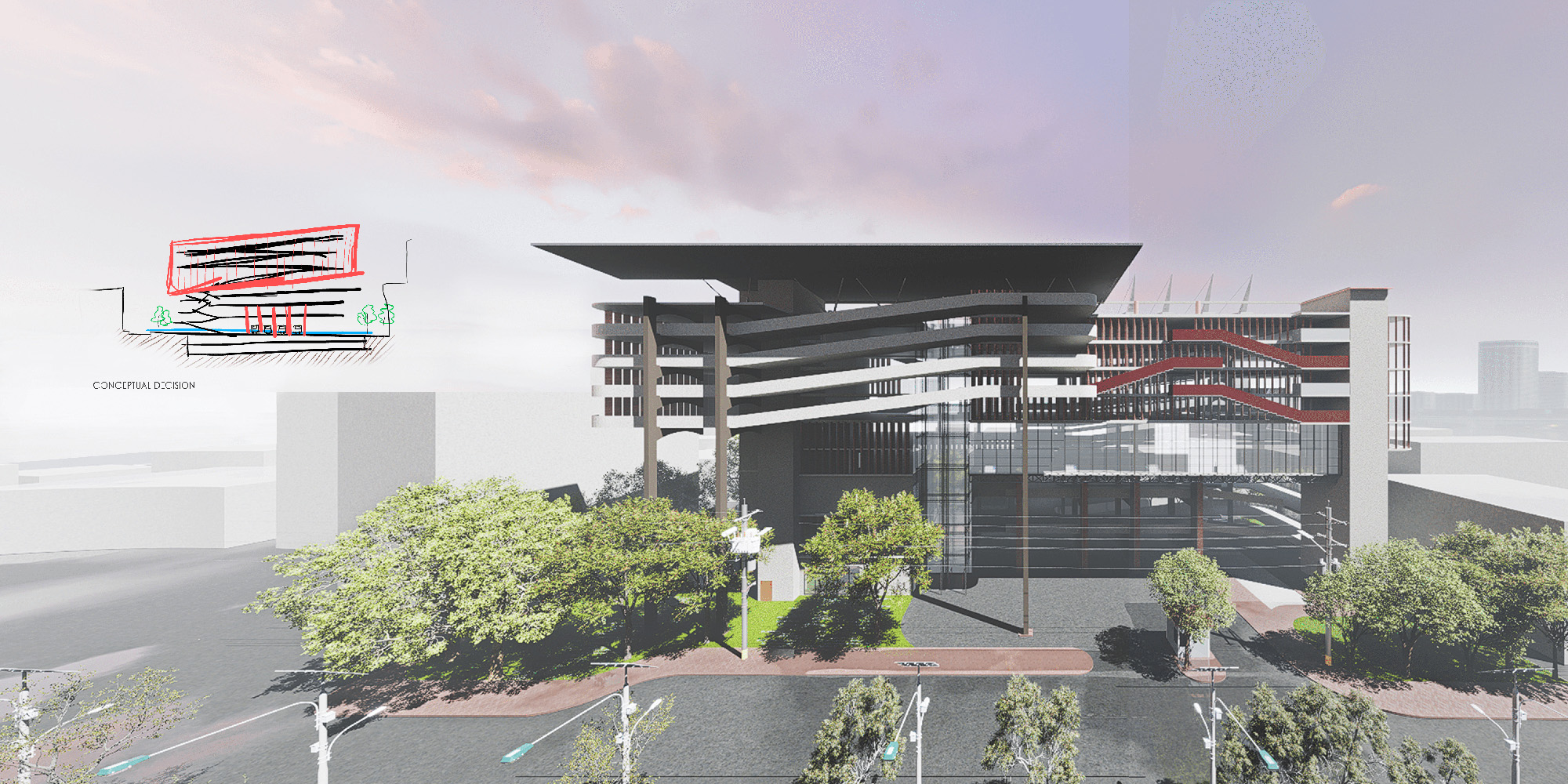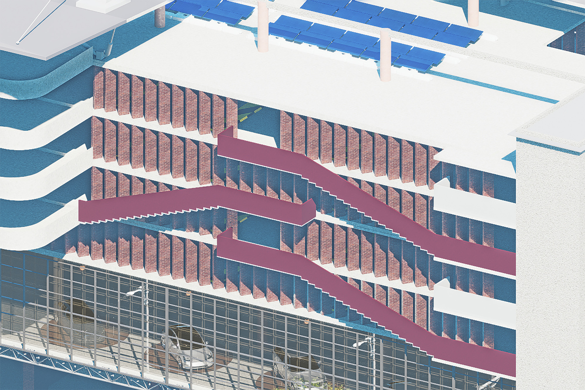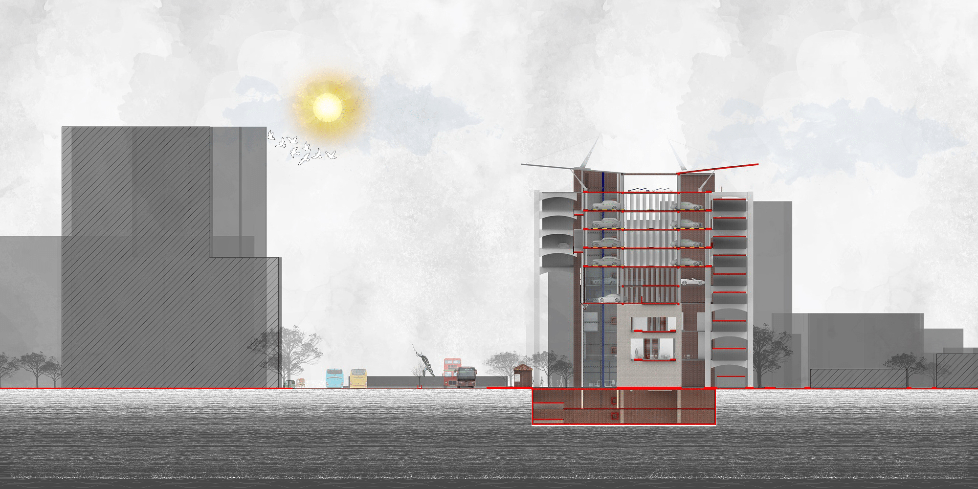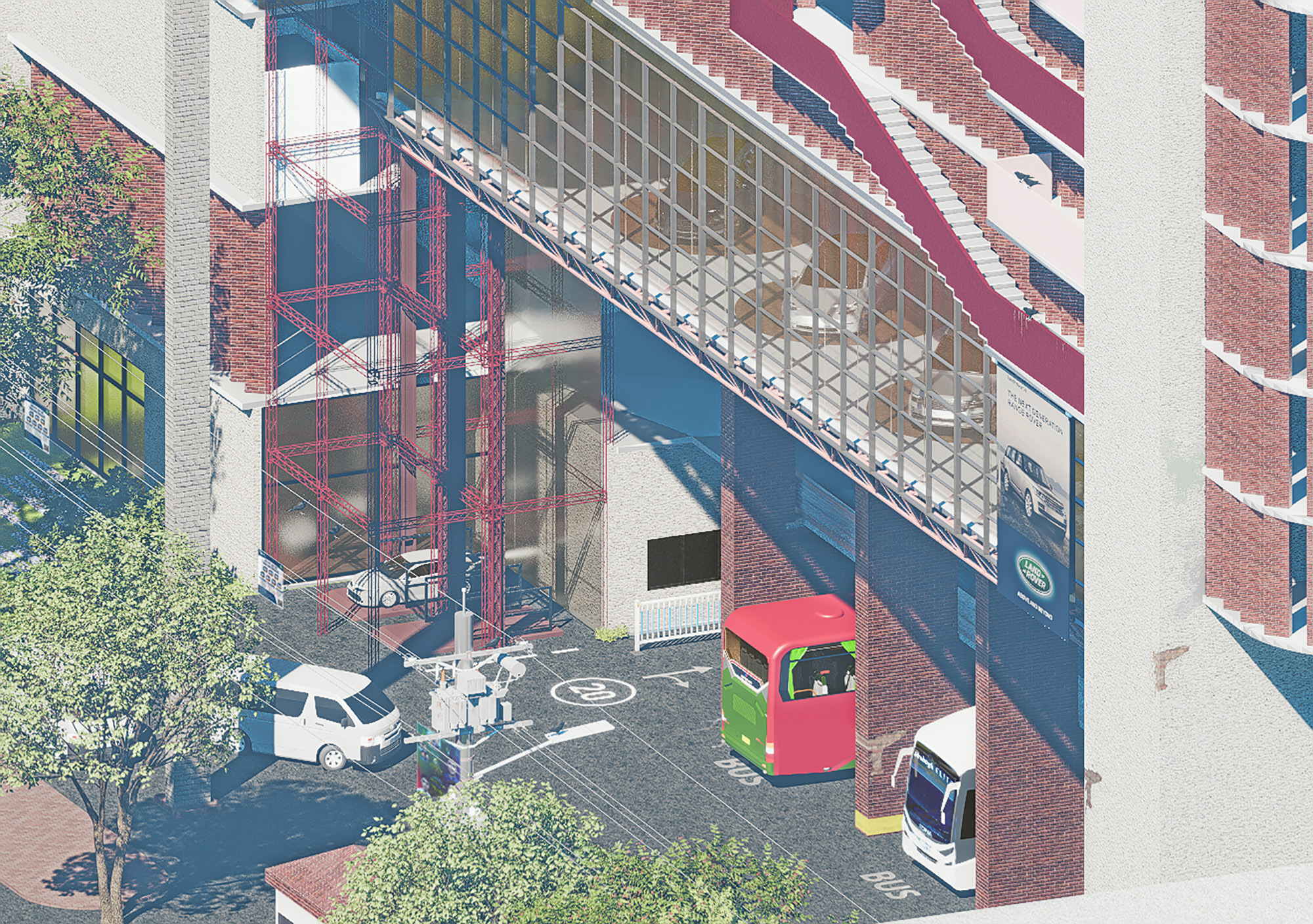 The project introduces a distinctive multi-level parking structure that integrates a car showroom, car-wash facility, cargo services, motor shops, and other mobility-related programs. The ground plane ensures efficient entry and exit points for both cars and buses, along with clearly defined parking areas and loading–unloading bays. Together, these interventions aim to streamline circulation, restore order, and transform the site into a more functional urban mobility hub.