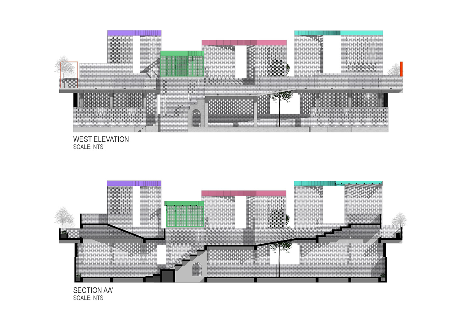The upper level breaks the symmetry, creating varied pockets for use: large steps for sitting, perforated brick enclosures for private activities such as women-led gatherings and open terraces overlooking the field. Light and air flow freely through ventilated brick façades that blur the boundary between inside and outside, turning the building into a mediator between climate and community.