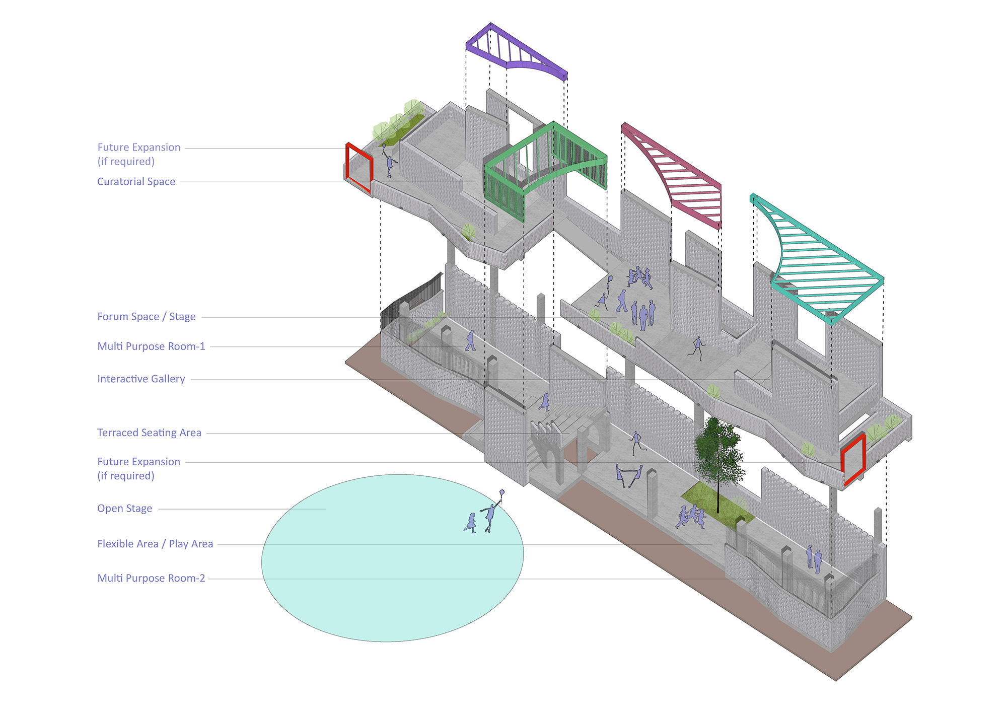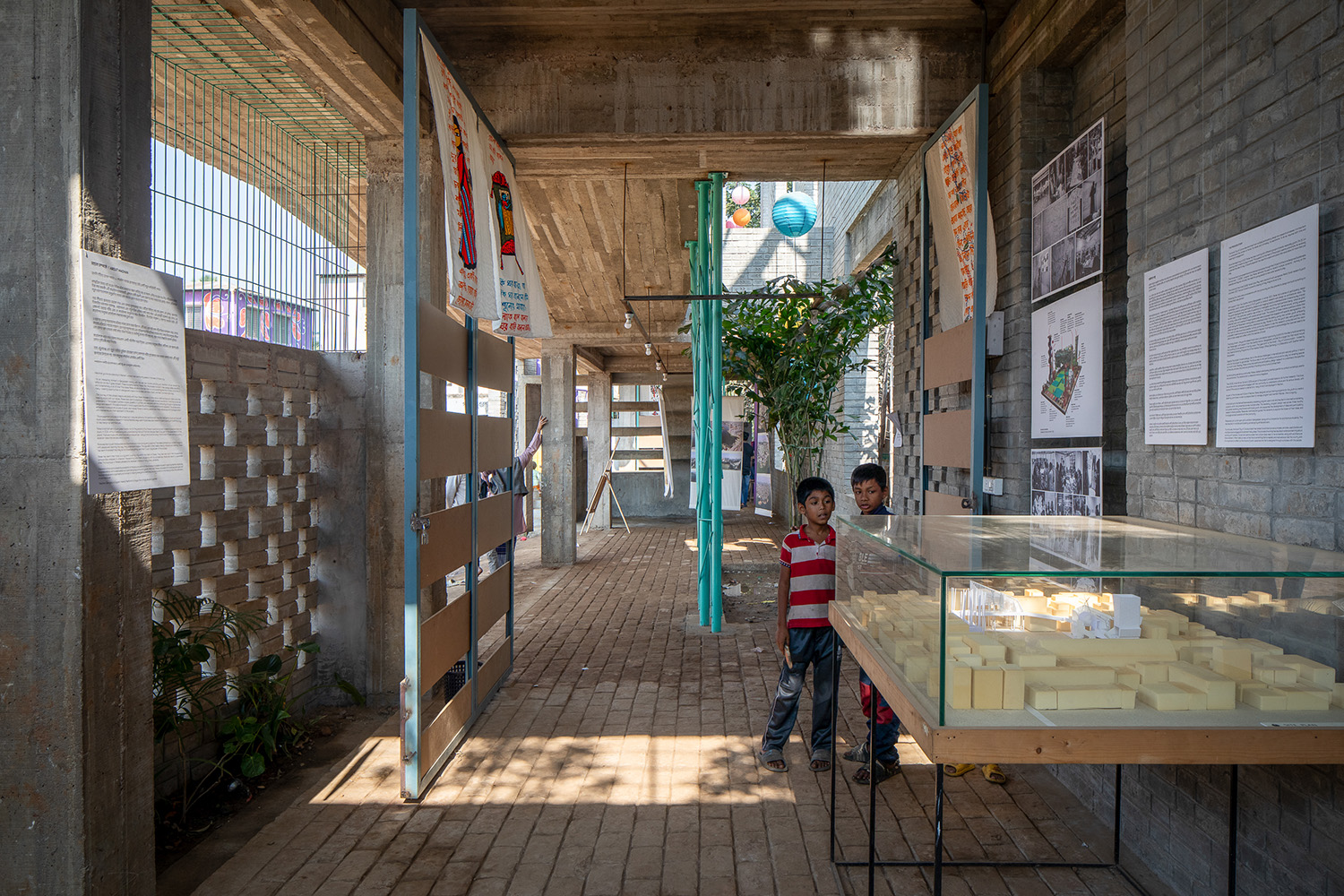 Architecturally, the project reinterprets the traditional Bengali pavilion as a light, permanent structure – robust yet porous, civic yet playful. A simple concrete frame supports two levels designed for openness and flexibility. On the ground floor, two semi-enclosed rooms host workshops, exhibitions and meetings. Large folding doors merge them into one shaded space facing the playground. A wide stair doubles as seating, turning circulation into an amphitheatre for performances and assemblies. The brick-paved ground absorbs heat and is easy to maintain.