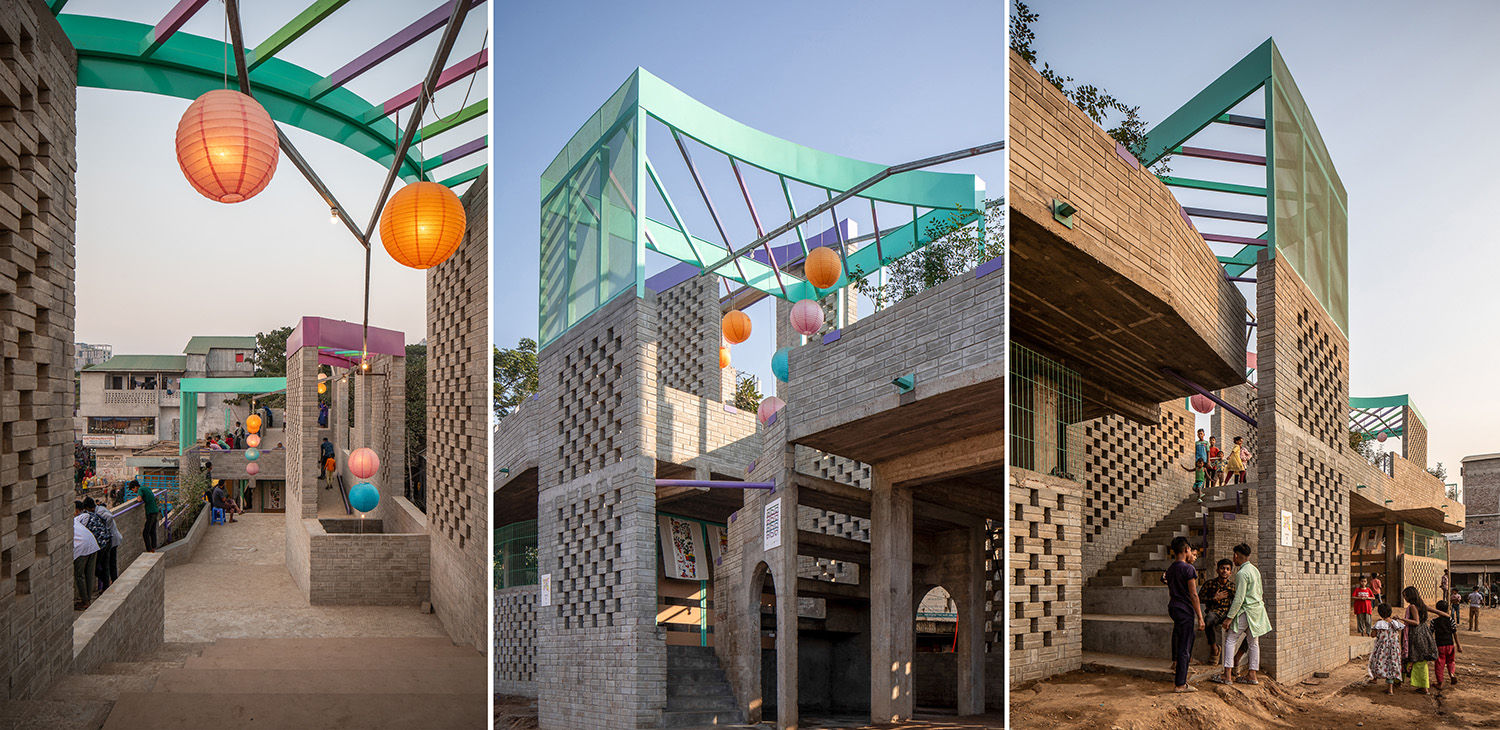 The name – Machan, meaning ‘platform’ in Bangla – captures its essence: a structure that supports and connects. It stands at Ershad Maidan, one of Korail’s few open spaces, long used for dumping waste. Paraa worked with local volunteers, students and collaborators including Floating University Berlin to transform the site into a shared stage for expression. Over 60 workshops and residencies shaped the design, bringing together residents and young designers through storytelling, model-making and hands-on construction.