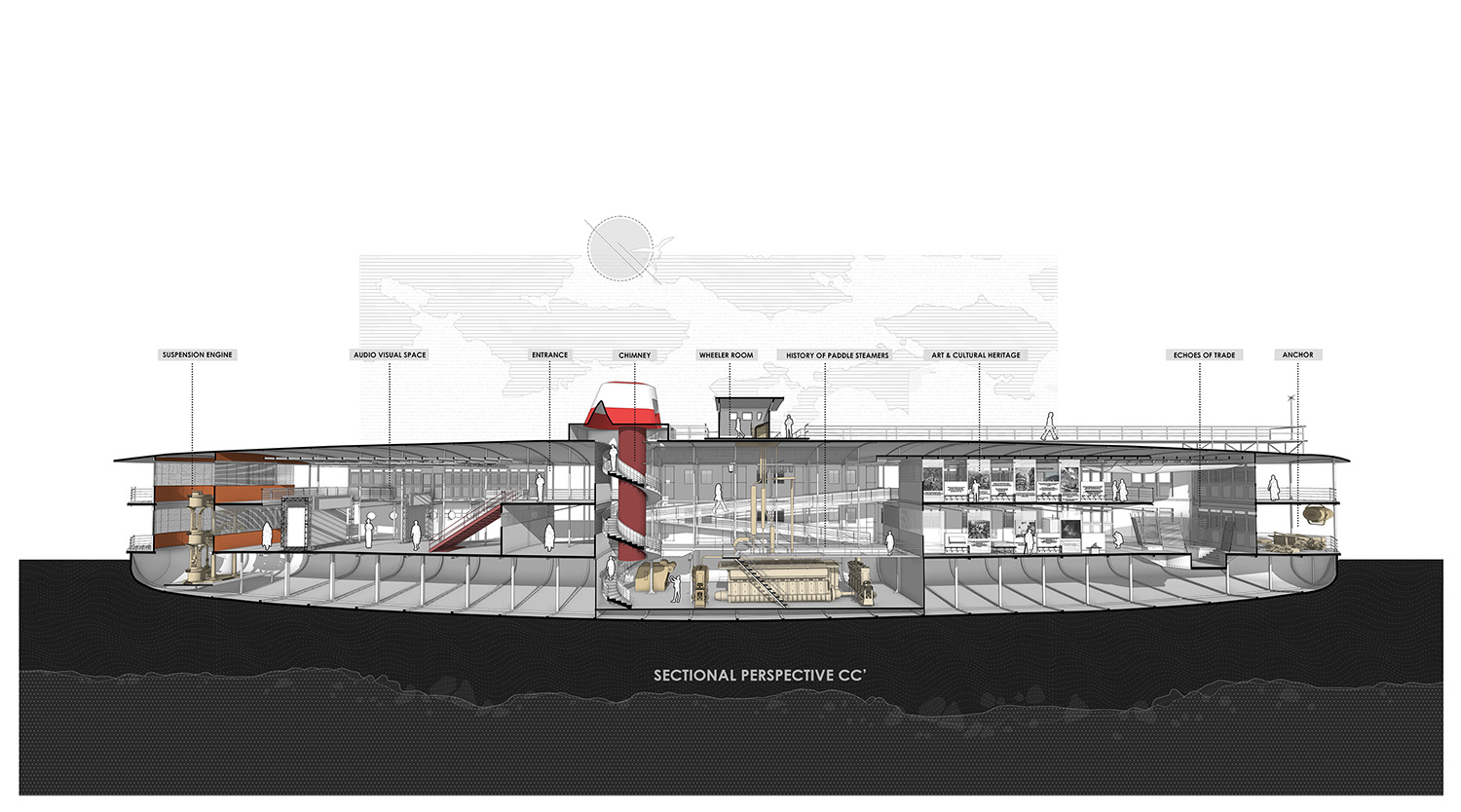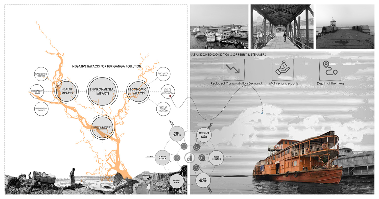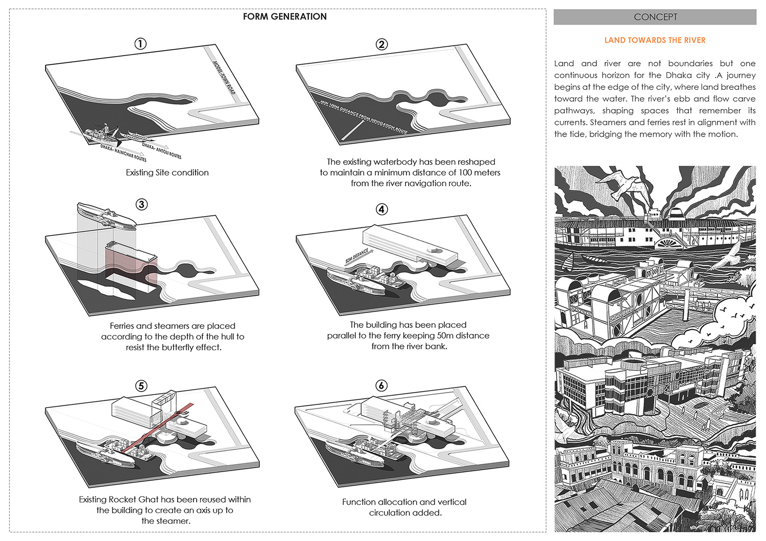 This student proposal re-imagines the Buriganga Riverfront by establishing a distinct architectural landmark that transforms the Buckland Embankment into a vital cultural destination. The project centers on the adaptive reuse of the historic BIWTC paddle steamer, popularly known as ‘Rocket Steamer’, into the Buriganga River Life Museum, creating a dynamic public space along the water’s edge. Surrounding this iconic vessel, a fleet of decommissioned ferries is repurposed through a modular design language, forming a unique floating complex of workshops and markets. Together, this ensemble forges a cohesive architectural identity—bridging the river’s industrial past with its ecological future—and acts as a catalyst for both cultural and urban renewal. -Editor