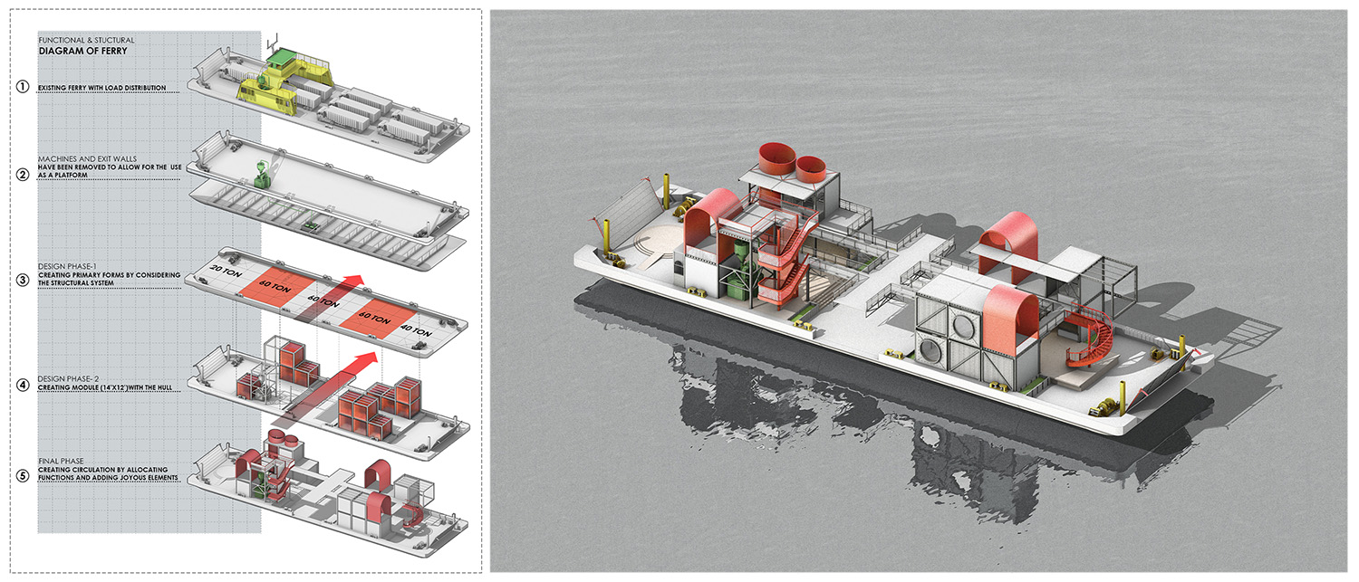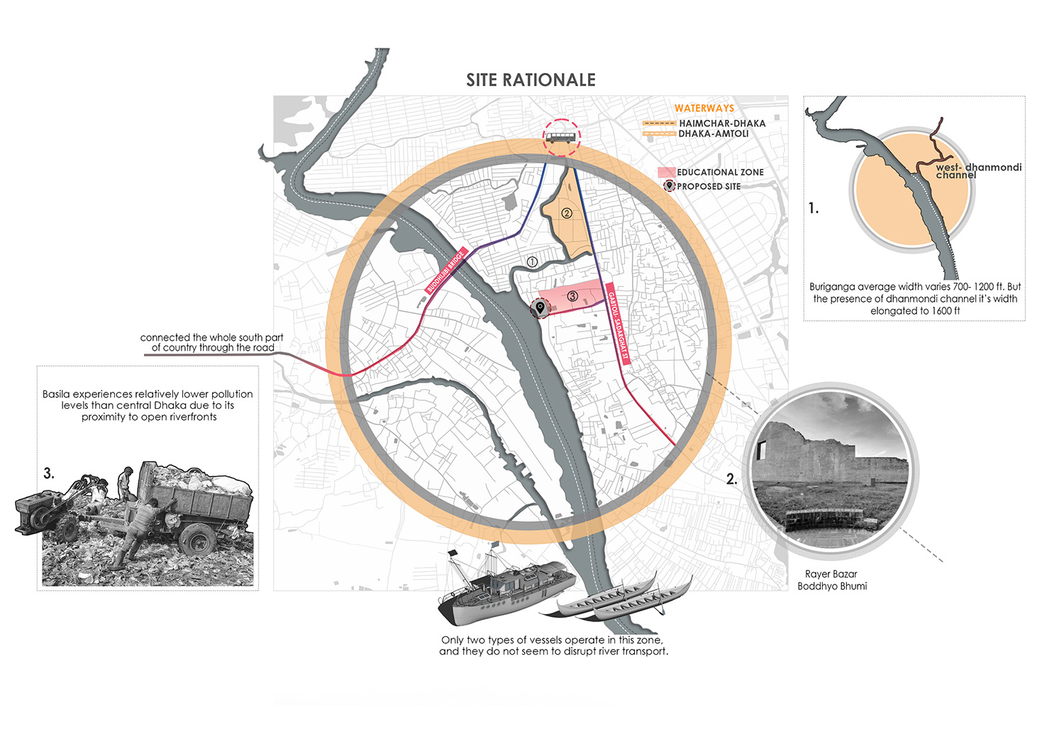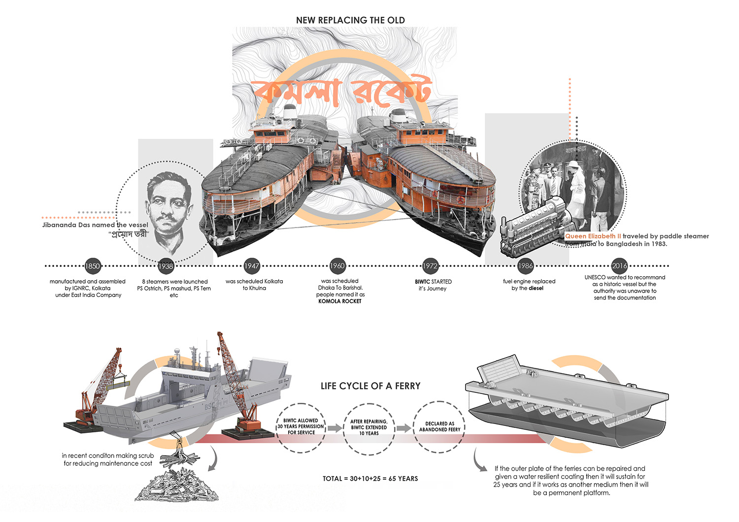 This student proposal re-imagines the Buriganga Riverfront by establishing a distinct architectural landmark that transforms the Buckland Embankment into a vital cultural destination. The project centers on the adaptive reuse of the historic BIWTC paddle steamer, popularly known as ‘Rocket Steamer’, into the Buriganga River Life Museum, creating a dynamic public space along the water’s edge. Surrounding this iconic vessel, a fleet of decommissioned ferries is repurposed through a modular design language, forming a unique floating complex of workshops and markets. Together, this ensemble forges a cohesive architectural identity—bridging the river’s industrial past with its ecological future—and acts as a catalyst for both cultural and urban renewal. -Editor