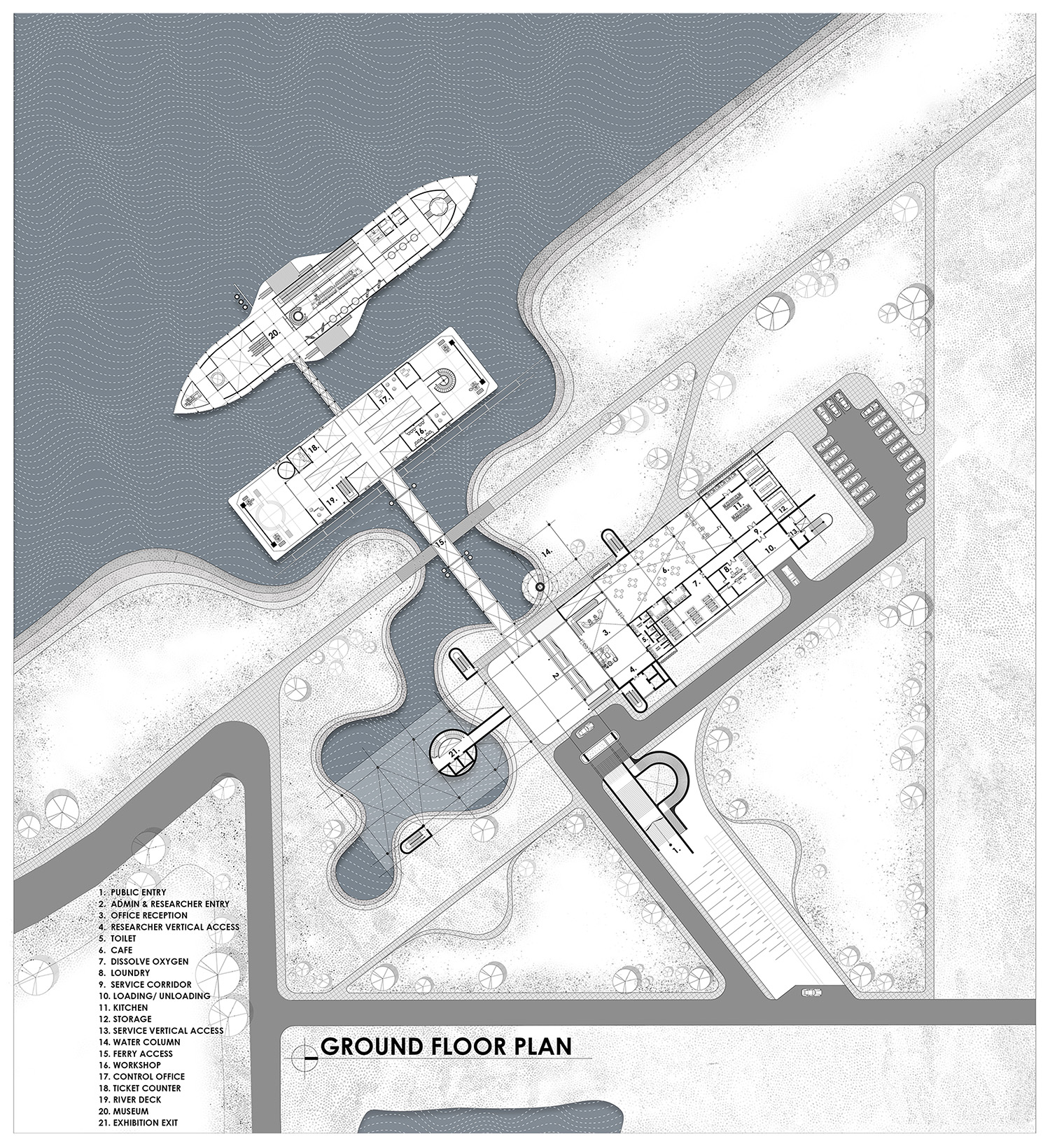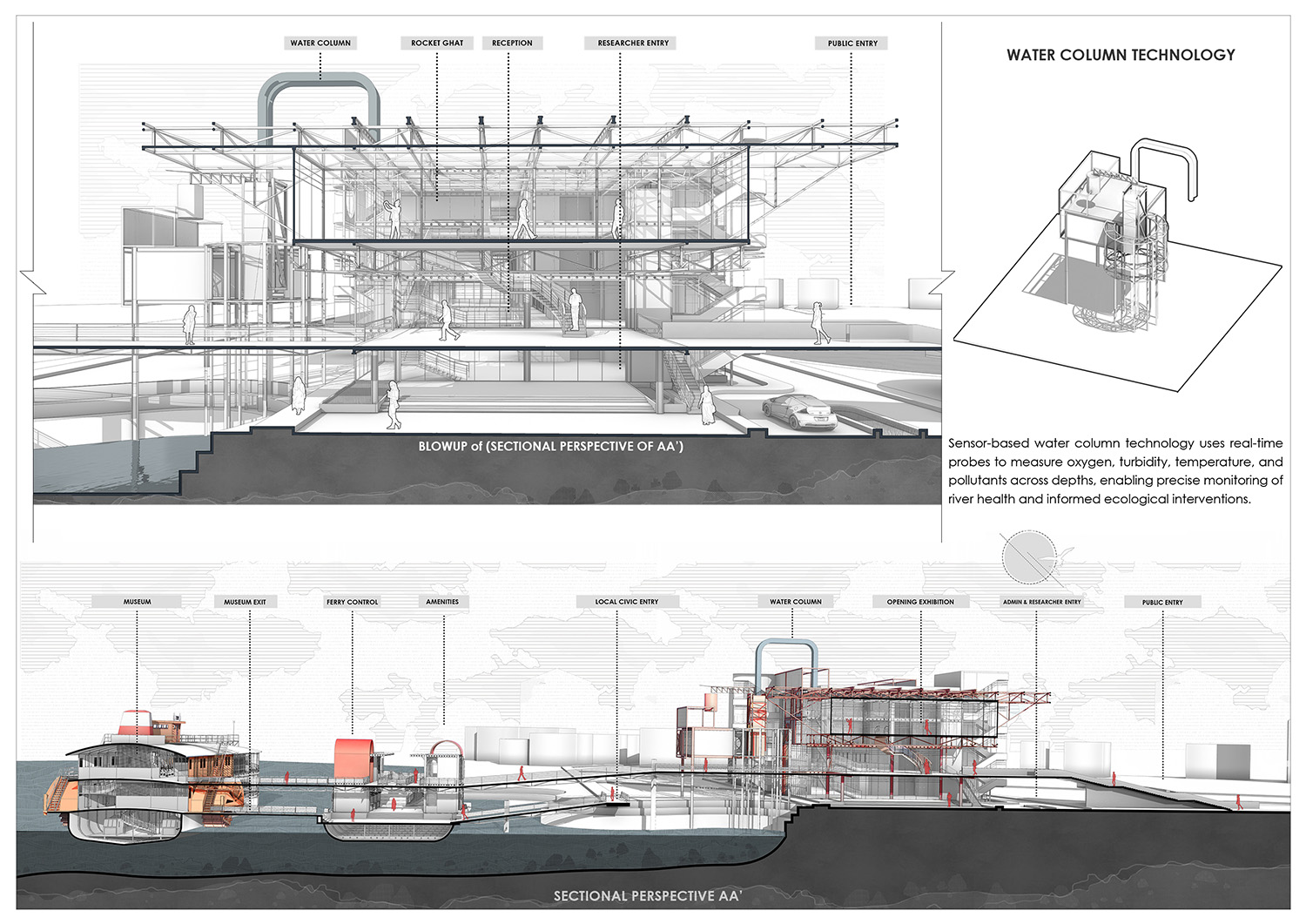 An onshore Water Research Centre anchors the intervention, integrating real-time water quality monitoring with ecological restoration research. Through data-driven analysis, experimental analysis, and phytoremediation strategies, the centre ensures that cultural revival is paired with measurable environmental impact.