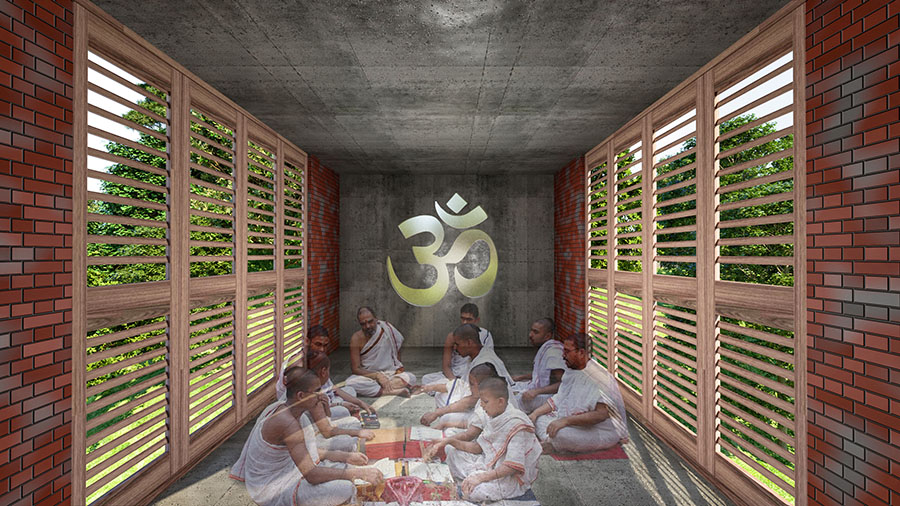 In harmony with the local terrain, all the temples are situated at various levels starting from 55’ to 200’. Most of the temples were built after 18th century. The first step before entering into design process was studying the existing pattern of the temples, buildings and their activity. Most of the temples have front arched entry, columnar circulation space around the main chamber.
